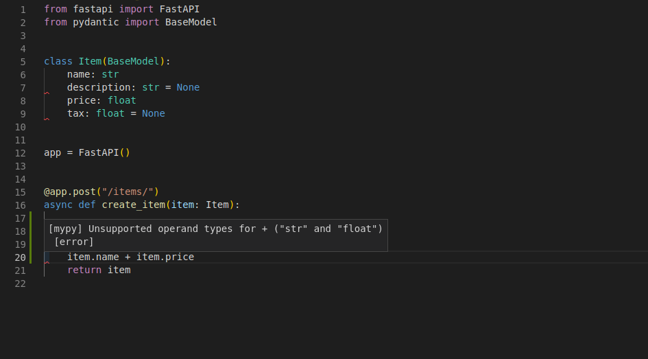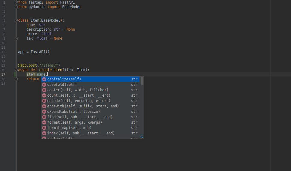 No seu editor de texto, dentro da função você receberá dicas de tipos e completação em todo lugar (isso não aconteceria se você recebesse um dict em vez de um modelo Pydantic):